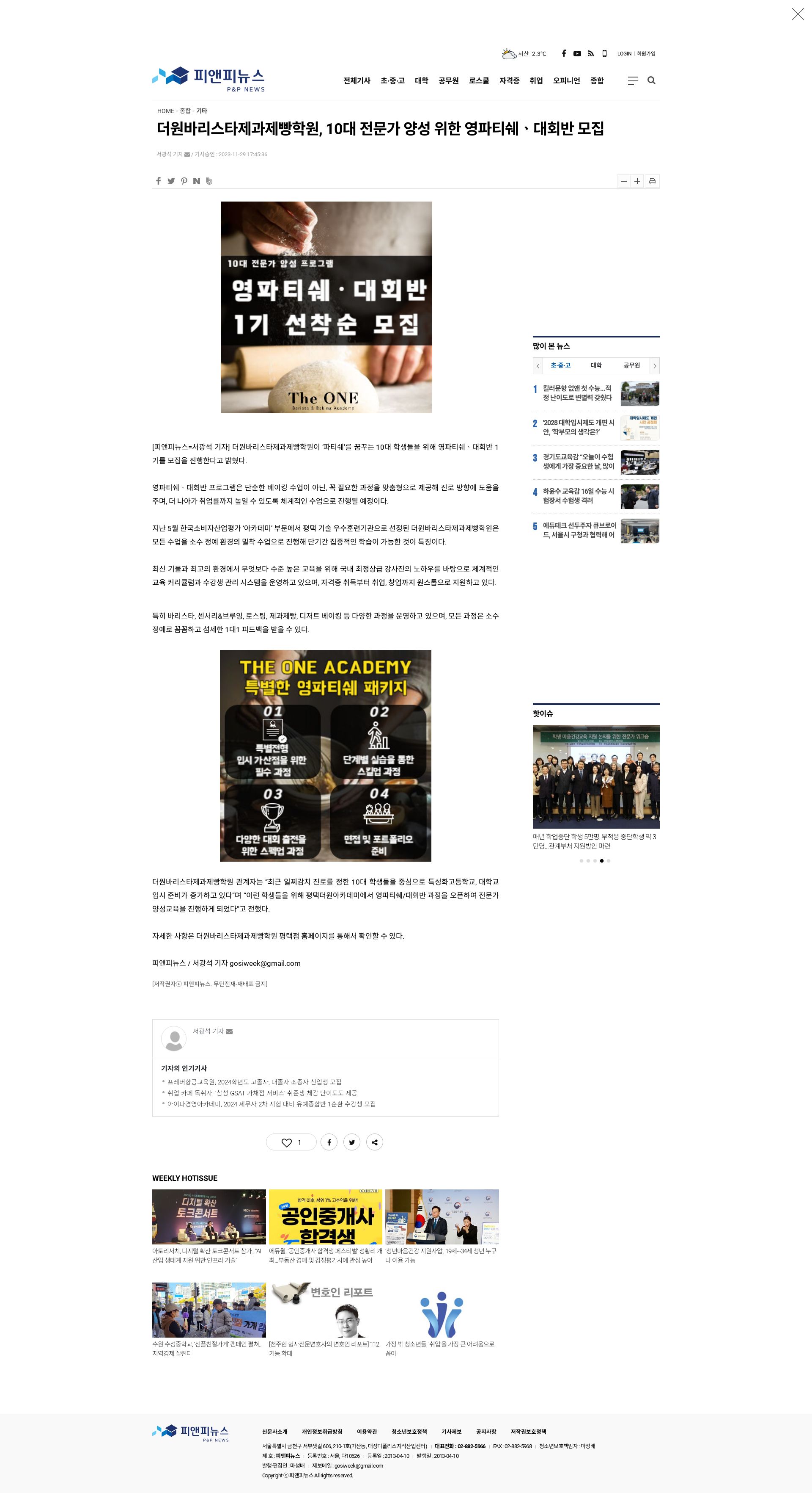 [뉴스] 더원바리스타제과제빵학원, 전문가 양성 위한 영파티쉐ᆞ대회반 모집
