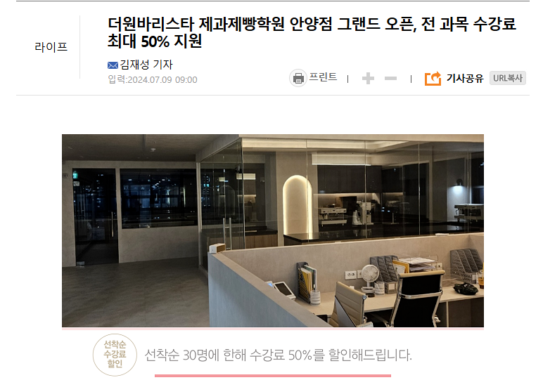 선정된 더원바리스타&제과제빵학원이 안양점에 신규 오픈 소식을 알렸다.