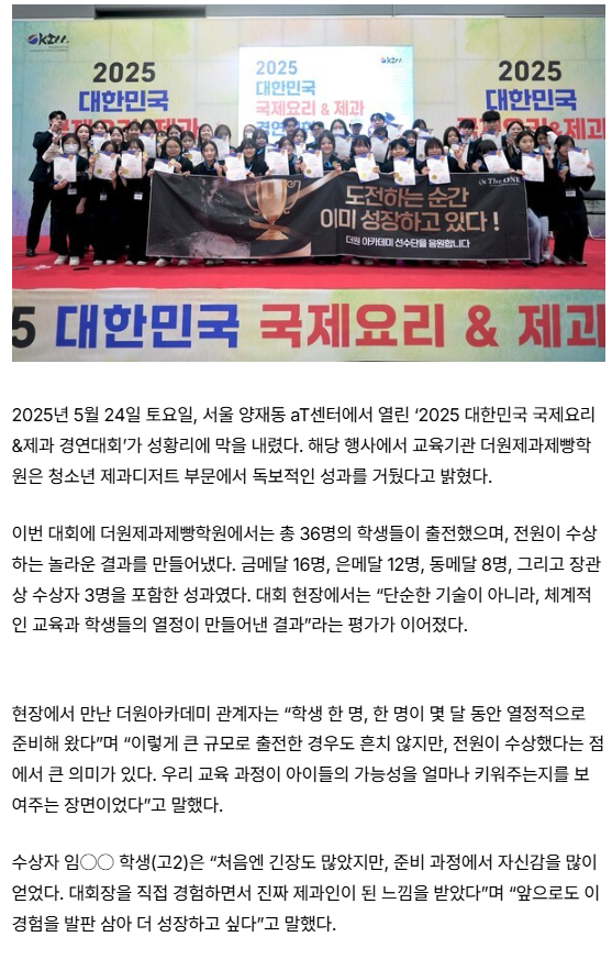 [뉴스] 더원제과제빵학원, ‘2025 대한민국 국제요리&제과 경연대회에서 36명 전원 수상